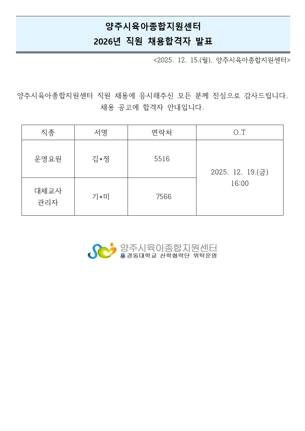[ä¿ë]2026³â ¾çÁÖ½ÃÀ°¾ÆÁ¾ÇÕÁö¿ø¼¾ÅÍ Á÷¿ø ÇÕ°ÝÀÚ ¹ßÇ¥(¿î¿µ¿ä¿ø, ´ëü±³»ç °ü¸®ÀÚ)