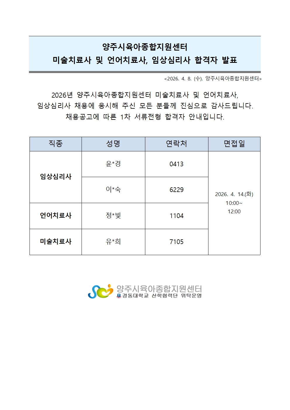 [ä¿ë] 2026³â Á¤¼½É¸®¹ß´ÞÁö¿ø»ç¾÷ ¹Ì¼úÄ¡·á»ç, ÀÓ»ó½É¸®»ç 1Â÷ ÇÕ°ÝÀÚ °ø°í