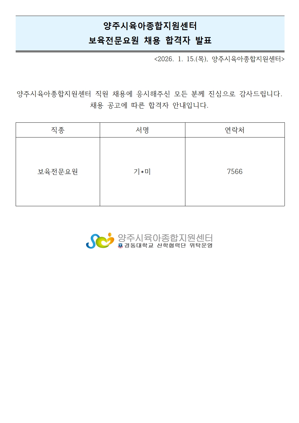 [ä¿ë] 2026³â ¾çÁÖ½ÃÀ°¾ÆÁ¾ÇÕÁö¿ø¼¾ÅÍ º¸À°Àü¹®¿ä¿ø ä¿ë °á°ú ¹ßÇ¥