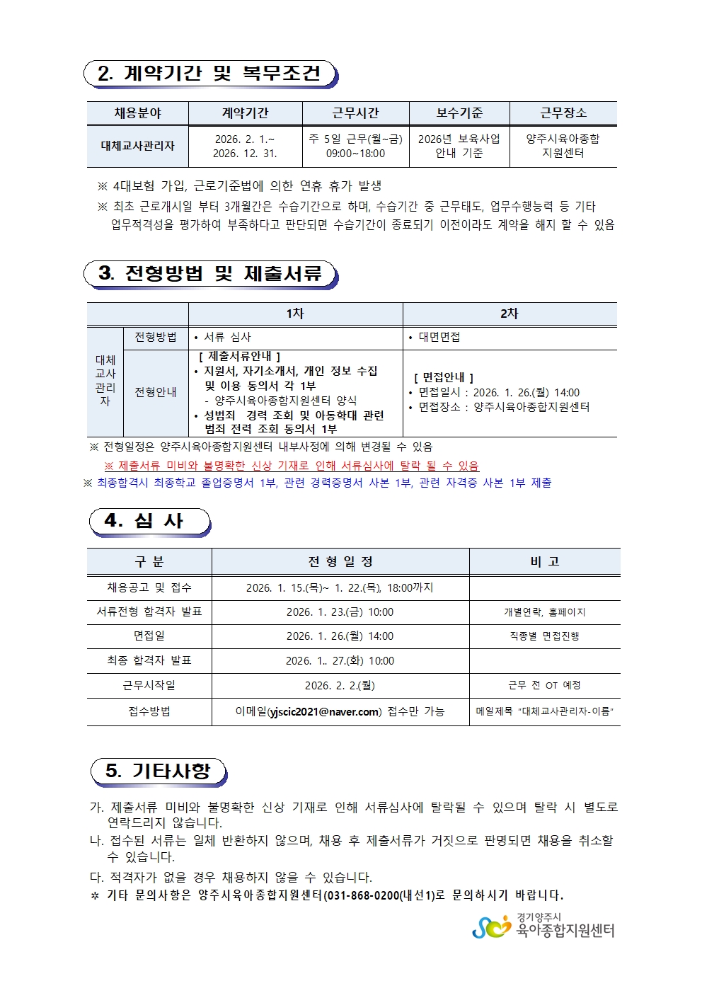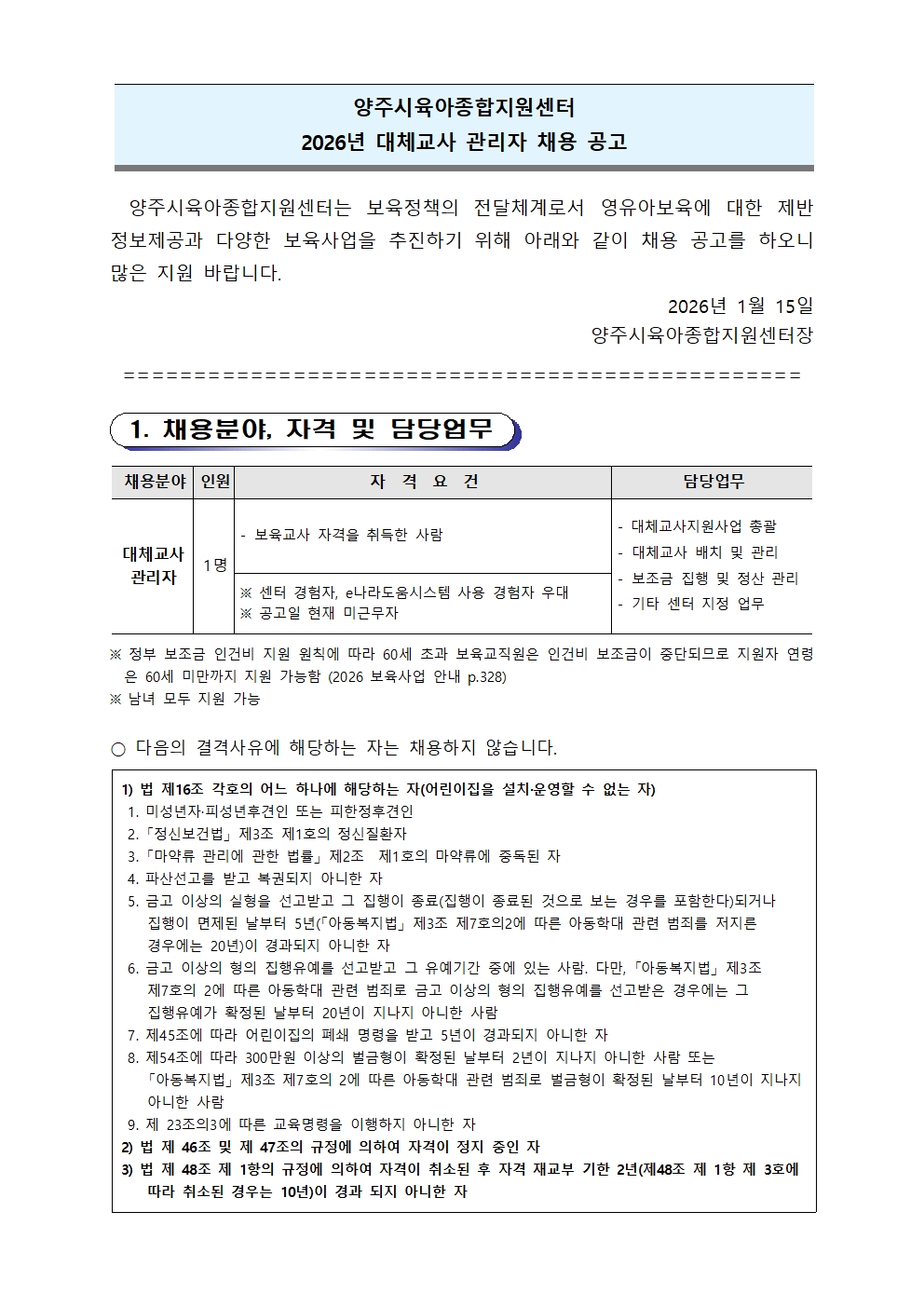 | [ä¿ë] 2026 ¾çÁÖ½ÃÀ°¾ÆÁ¾ÇÕÁö¿ø¼¾ÅÍ ´ëü±³»ç°ü¸®ÀÚ Ã¤¿ë°ø°í | |||||