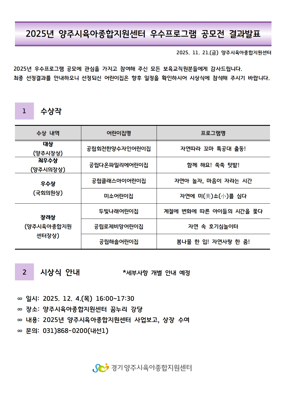 [°ø¸ð] 2025³â ¾çÁÖ½ÃÀ°¾ÆÁ¾ÇÕÁö¿ø¼¾ÅÍ ¿ì¼öÇÁ·Î±×·¥ °ø¸ðÀü °á°ú ¾È³»