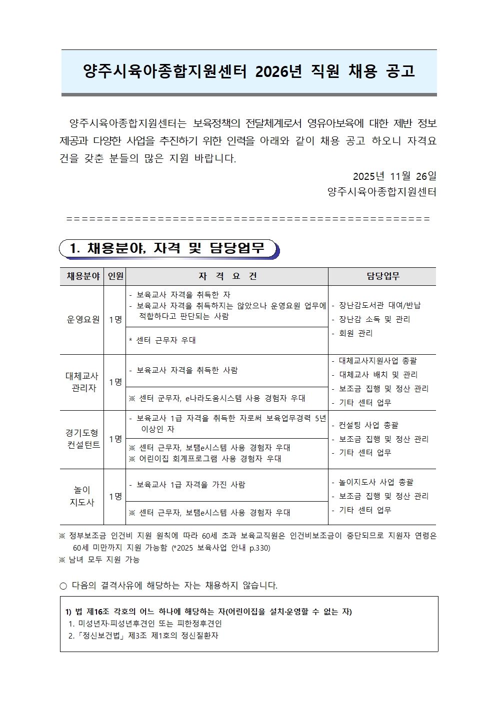 [ä¿ë] 2026³â ¾çÁÖ½ÃÀ°¾ÆÁ¾ÇÕÁö¿ø¼¾ÅÍ Á÷¿ø ä¿ë °ø°í