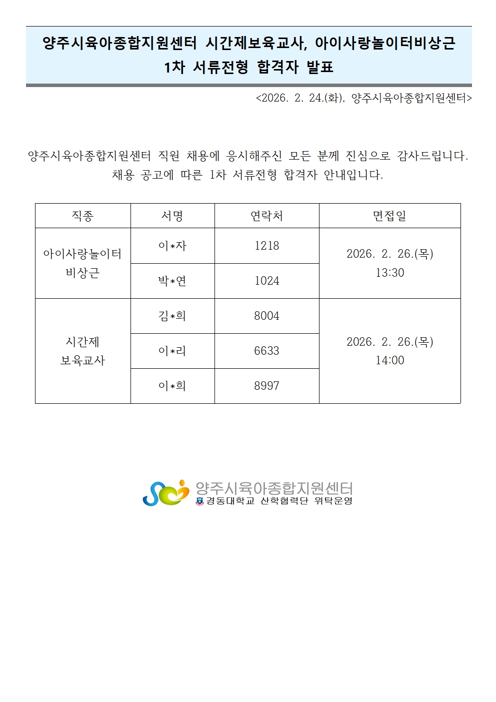 [ä¿ë] 2026³â ½Ã°£Á¦º¸À°±³»ç, ¾ÆÀÌ»ç¶û³îÀÌÅÍ ºñ»ó±Ù 1Â÷ ¼·ùÀüÇü ÇÕ°ÝÀÚ¹ßÇ¥